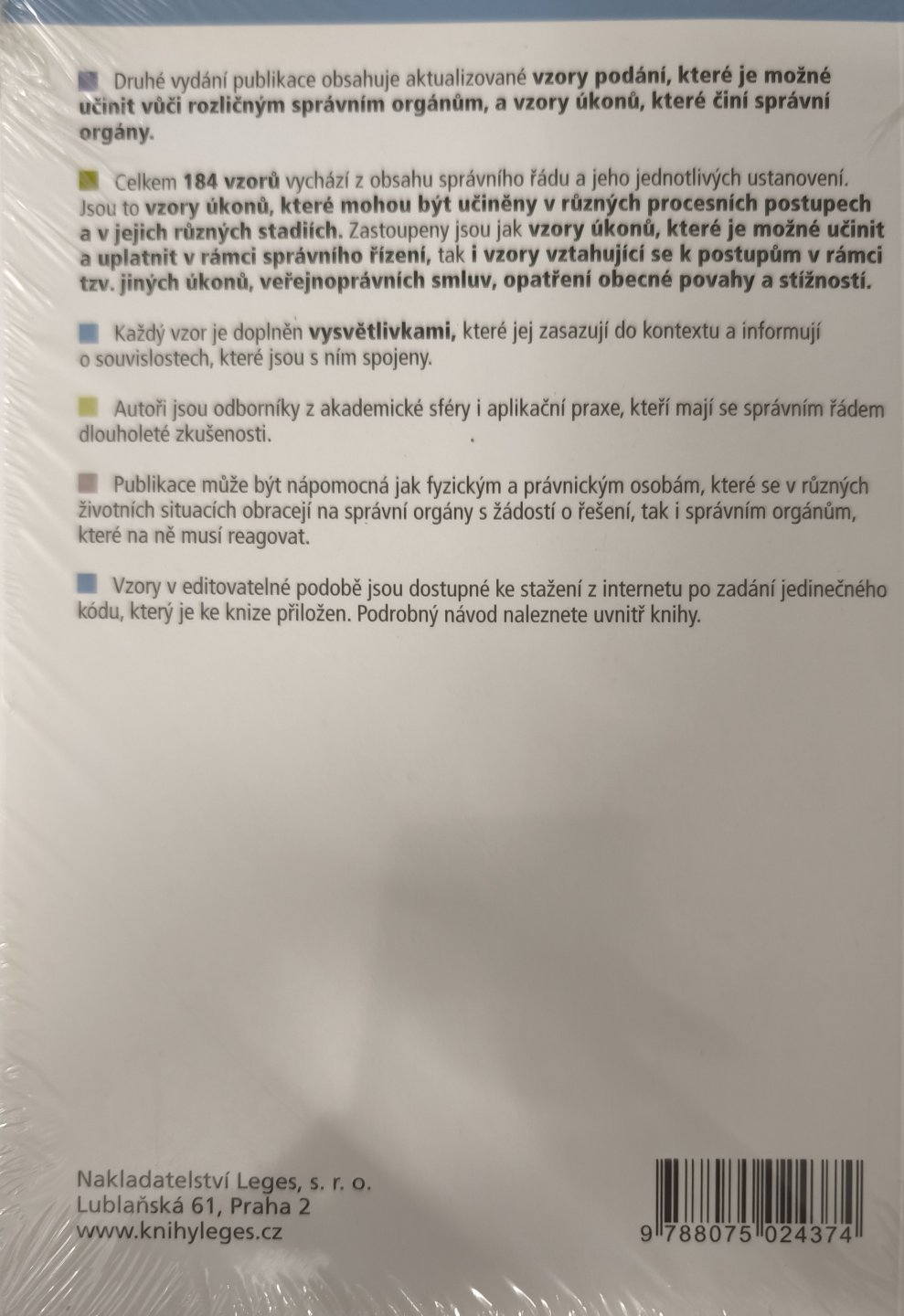 Praktická publikace z oblasti správního práva procesního zaměřená na vzory podání a úkonů podle správního řádu. Slouží jako pomůcka pro orientaci v postupech správních orgánů a při uplatňování práv a povinností ve správním řízení i dalších správních postupech.